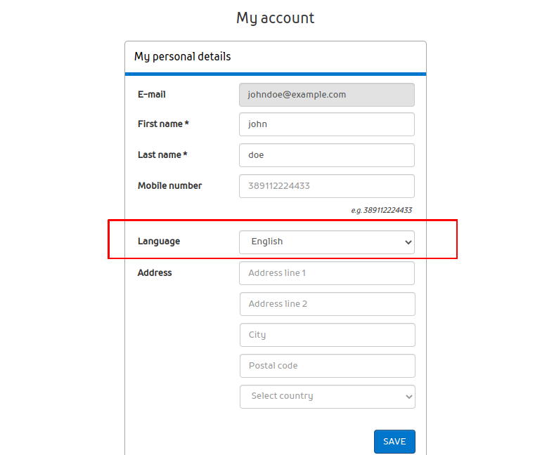 Once a user logs into the portal, he is able to change the account-wide language via My account section.