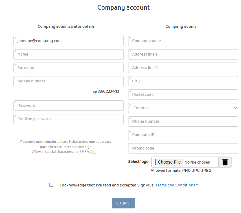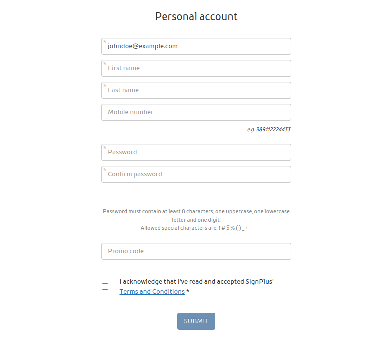 Ако немате креирано Sign Plus корисничка сметка, може да се регистрирате со внесување на валидна e-mail адреса и безбедносен код. За да продолжите со регистрацијата, следете ги инструкциите што се испратени на Вашата e-mail адреса. Во следниот чекор при регистрација, морате да одберете каков тип на сметка сакате да отворите. Може да одберете помеѓу "Лична Сметка" или "Компаниски Профил".